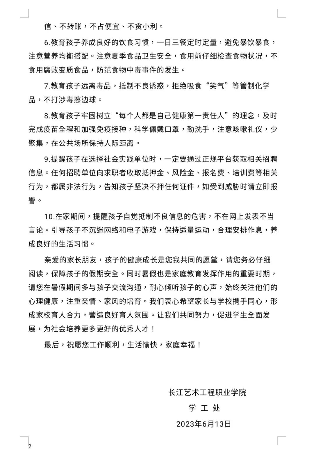 长江艺术工程职业学院2023年暑假致家长一封信,请查收!
